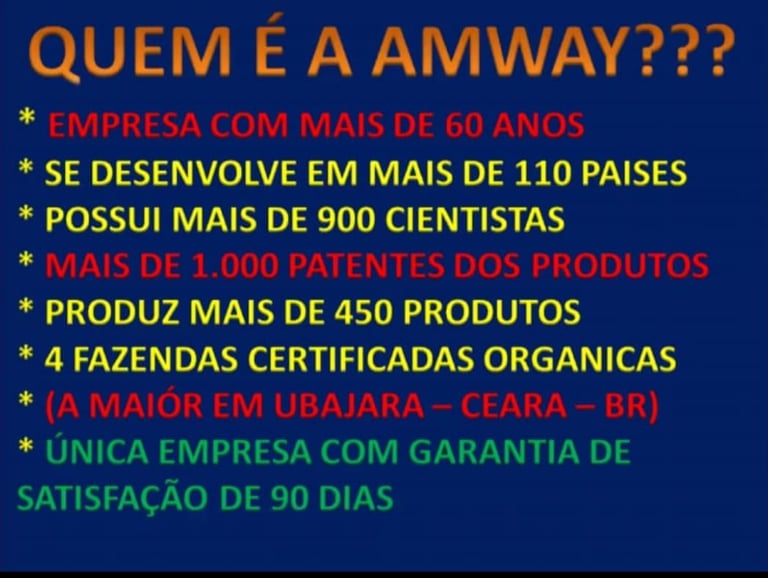 Com mais de 60 anos de história, a Amway é uma das maiores e mais reconhecidas empresas de vendas diretas do mundo. Presente em mais de 110 países, a marca se destaca pela inovação e alta qualidade de seus produtos, incluindo cosméticos, suplementos nutricionais e itens de cuidados pessoais.